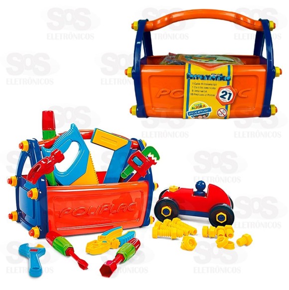 Itens: 1 Martelo, 1 Alicate, 1 Serrote, 1 Esquadro, 1 Chave Grifo, 1 Chave Inglesa, 1 Chave Philips, 1 Chave de Fenda, 1 Chave Canhão, 10 Parafusos plásticos c/ porcas, 1 Carrinho e 1 Caixa de Ferramentas.