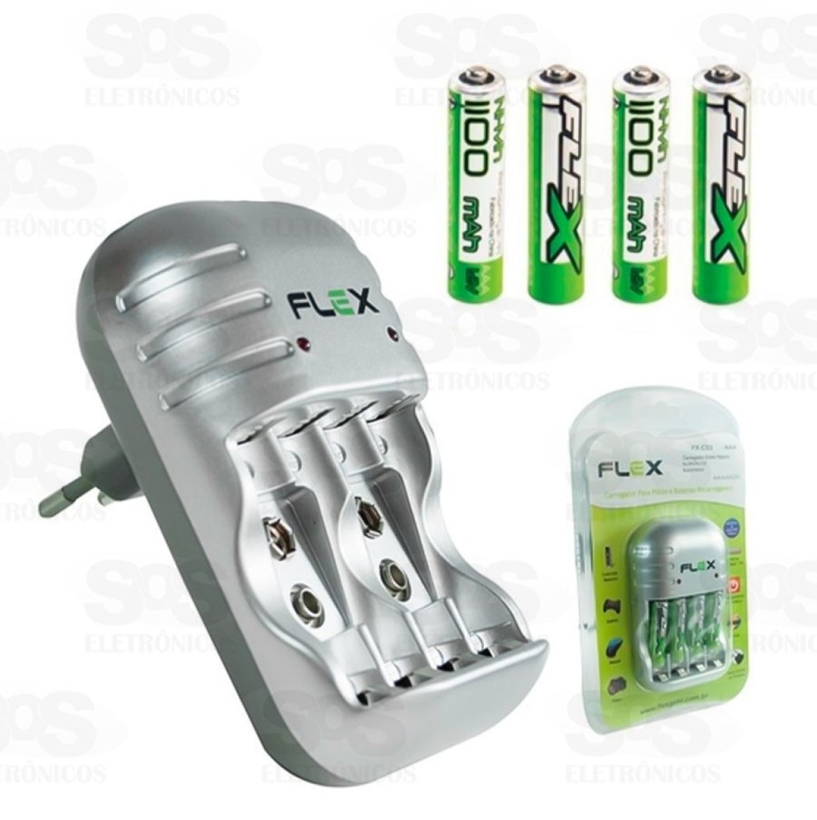 Carregador Com 4 Pilhas AAA Recarregáveis Flex FX-C03 AAA