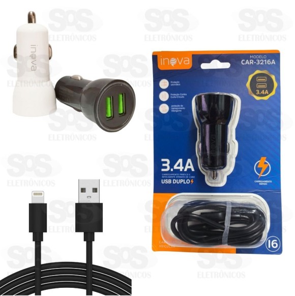 Carregador Veicular 2 USB 3.4A Cabo Iphone Inova CAR-3216A