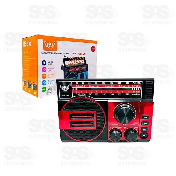 Com carregamento solar Mini Rádio Retrô Bluetooth AM/FM 3 Bandas Altomex AD-231 Um encantador rádio de estilo retrô com capacidade para sintonizar em três bandas diferentes: AM, FM e SW. Destaca-se pela excelente captação de sinal. Sua bateria recarregável e inclui entrada USB, leitor de cartão SD, cabo AUX e conectividade Bluetooth. Acompanha um cabo para carregamento conveniente. Inclui um cabo para recarregar sua bateria. CARACTERÍSTICAS - Recepção FM/AM/SW - Bateria recarregável - Antena de alta sensibilidade - Alimentação: 3V(UM-1x2PCS) CORES VARIADAS - Medida: 17,5 x 12,5 x 7 cm (C x A x L)
