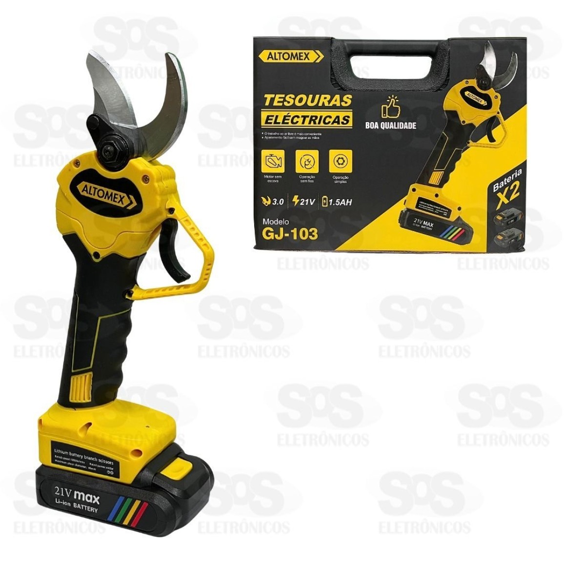 Tesoura Elétrica Recarregável Altomex GJ-103 Ferramenta indispensável para profissionais e entusiastas da jardinagem. Esta tesoura oferece cortes precisos e sem esforço, tornando a manutenção do jardim uma tarefa rápida e agradável. Acompanha duas baterias de Li-íon de 21V, proporcionando liberdade de movimento e eliminando a necessidade de cabos de alimentação. Lâminas afiadas de alta qualidade. Confortável de segurar e usar por longos períodos, reduzindo a fadiga do usuário e proporcionando controle máximo durante o trabalho de poda. Tamanho: 31 x 11 cm