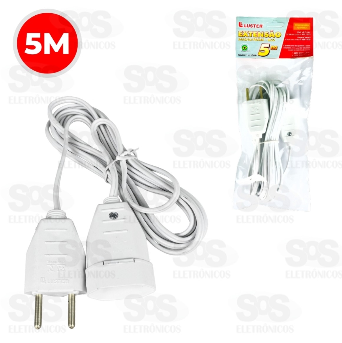 Extensão Simples 5 Metros 10A 2P Luster 2185Fio 2 x 0,75 mm²Certificado conforme NBR13249/141362200W EM 220V1270W em 127VExtensão macho/fêmea BCO