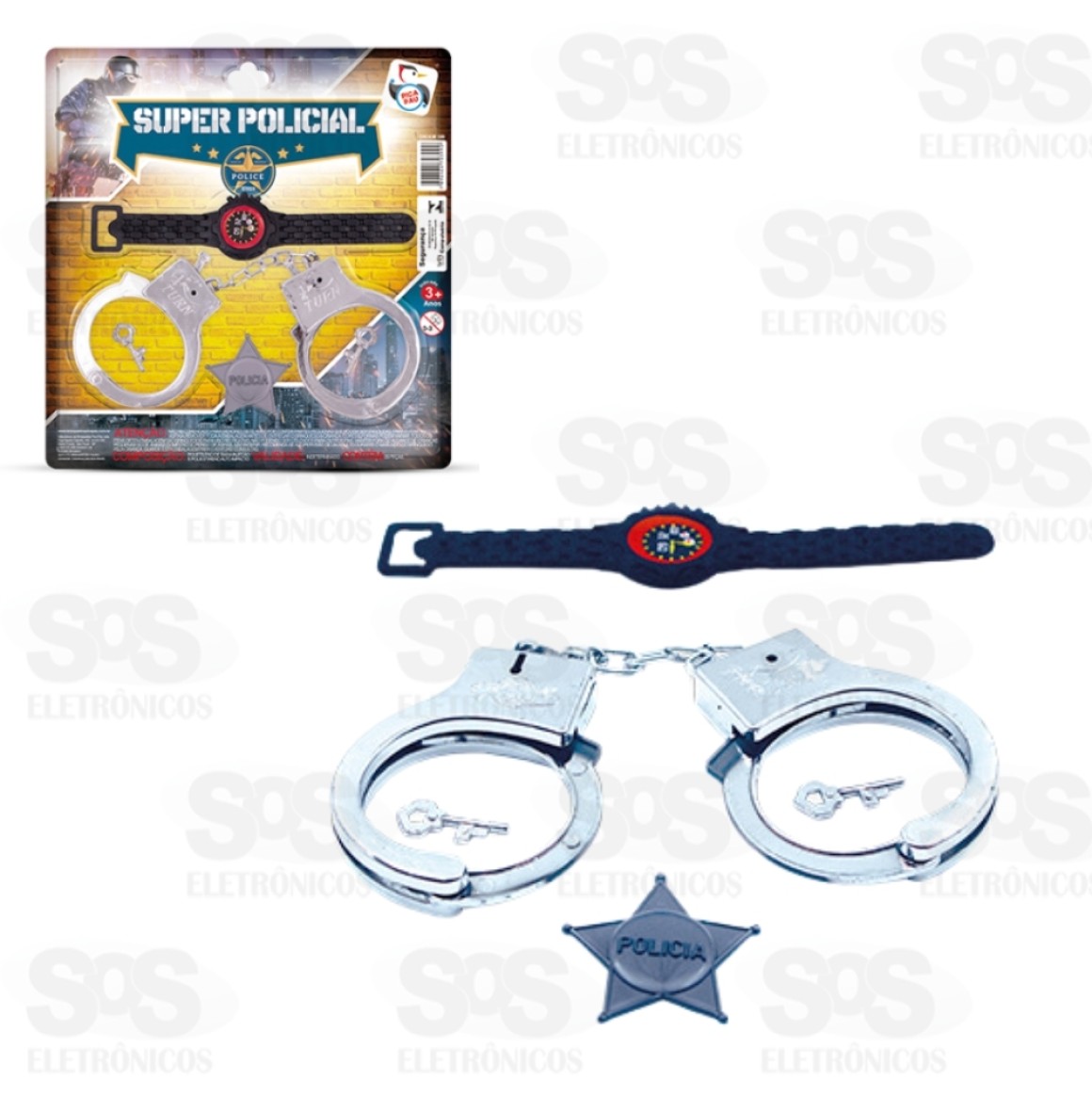 Kit Policial Algema Distintivo e Relógio Pica Pau 399 Com selo do Inmetro Não é recomendável para menores de 3 anos 01 Algema 01 Distintivo 01 Relógio Tamanho da Embalagem: (AxLxC); 23 x 1 x 24 cm